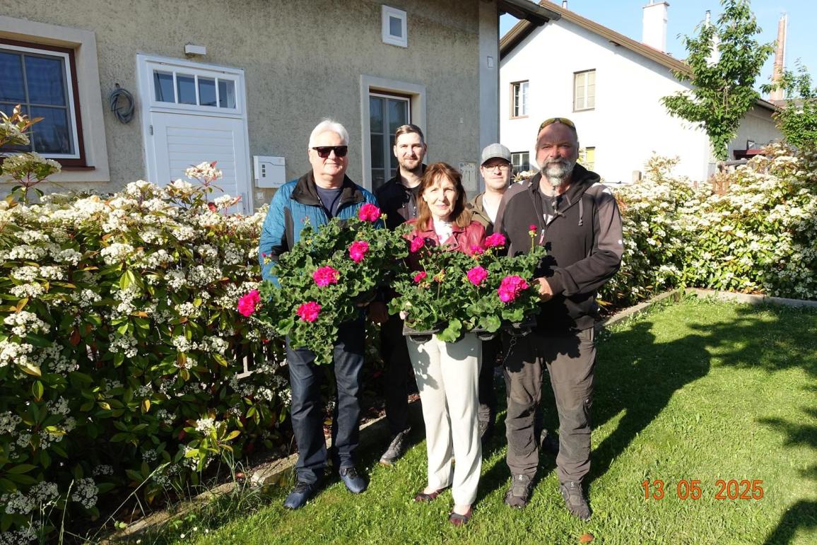 Die Verteilung der Blumen an die KoloniebewohnerInnen übernahmen die engagierten Gartenarbeiter der Hausverwaltung (Andi Knoll, Manuel Knoll, Patrick Knoll, Patrick Holzer). Damit wird nicht nur das Stadtbild verschönert, sondern auch ein wertvoller Beitrag für die Insektenvielfalt geleistet.