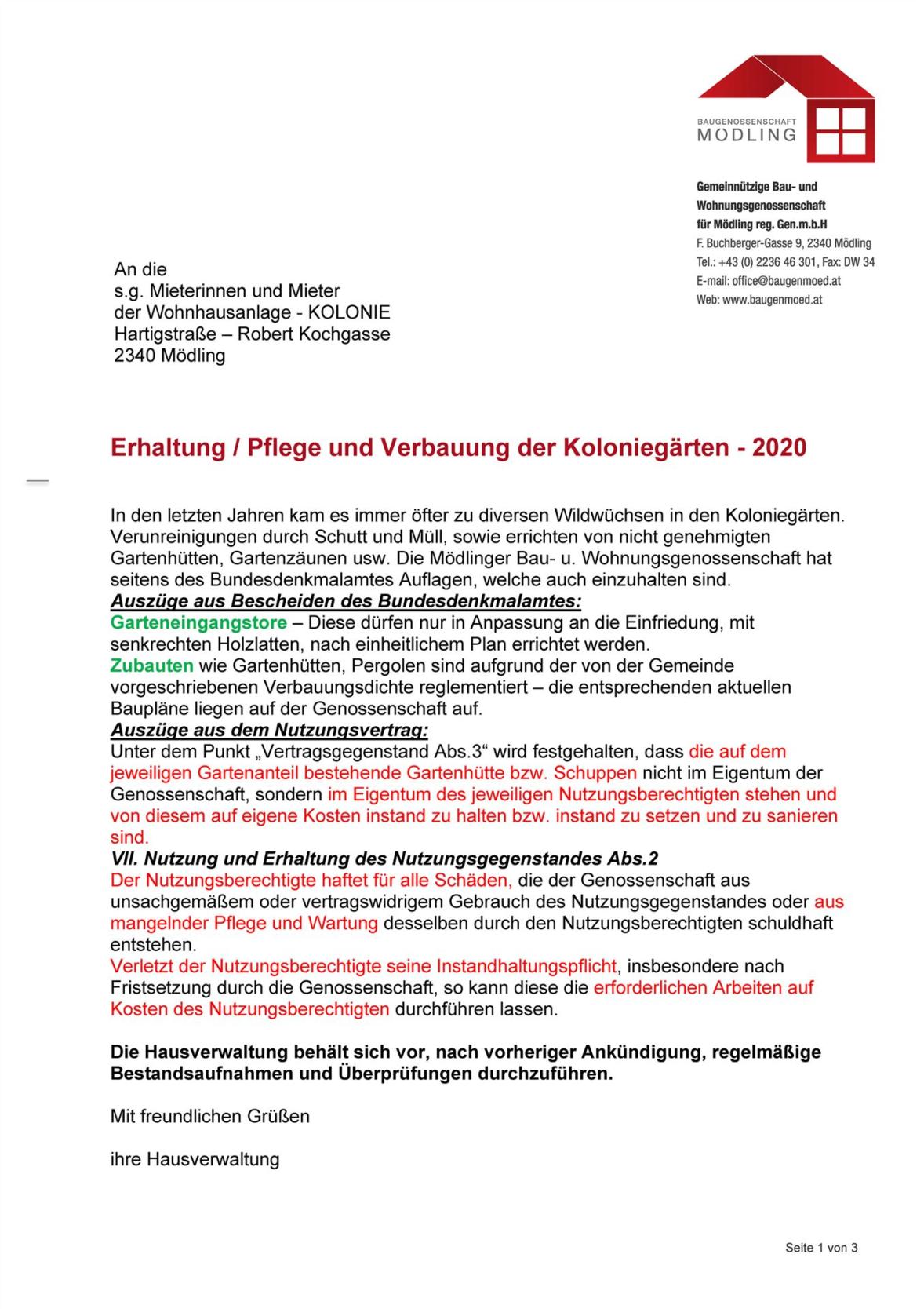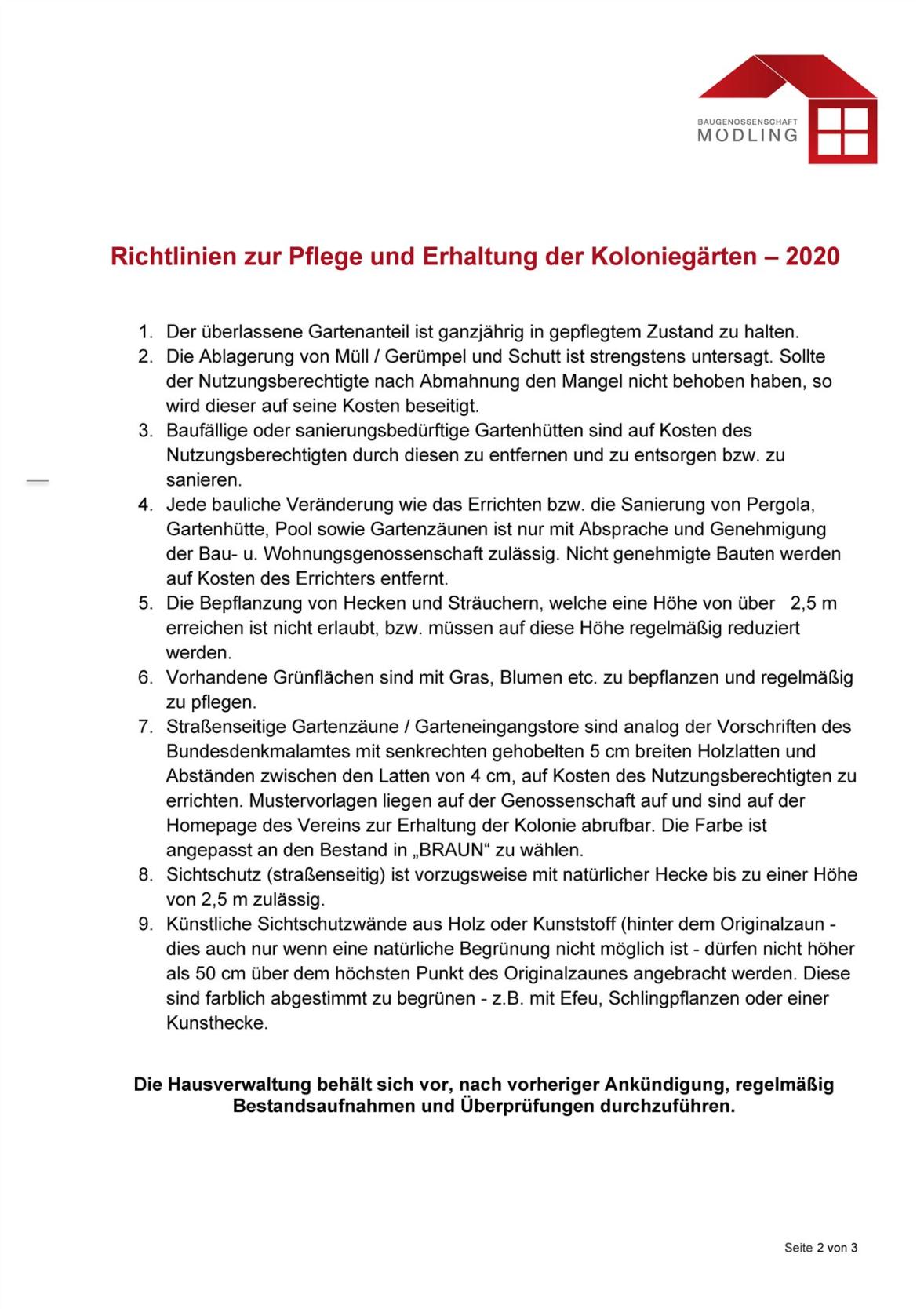 Die Hausverwaltung hat Richtlinien zur Pflege und Erhaltung der Koloniegärten herausgegeben. Diese wurden in Zusammenarbeit mit dem Vereinsvorstand erarbeitet. Wir hoffen, dass die immer wieder aufkommenden Diskussionen bezüglich nicht gepflegter oder vermüllter Gärten nun ein Ende haben.