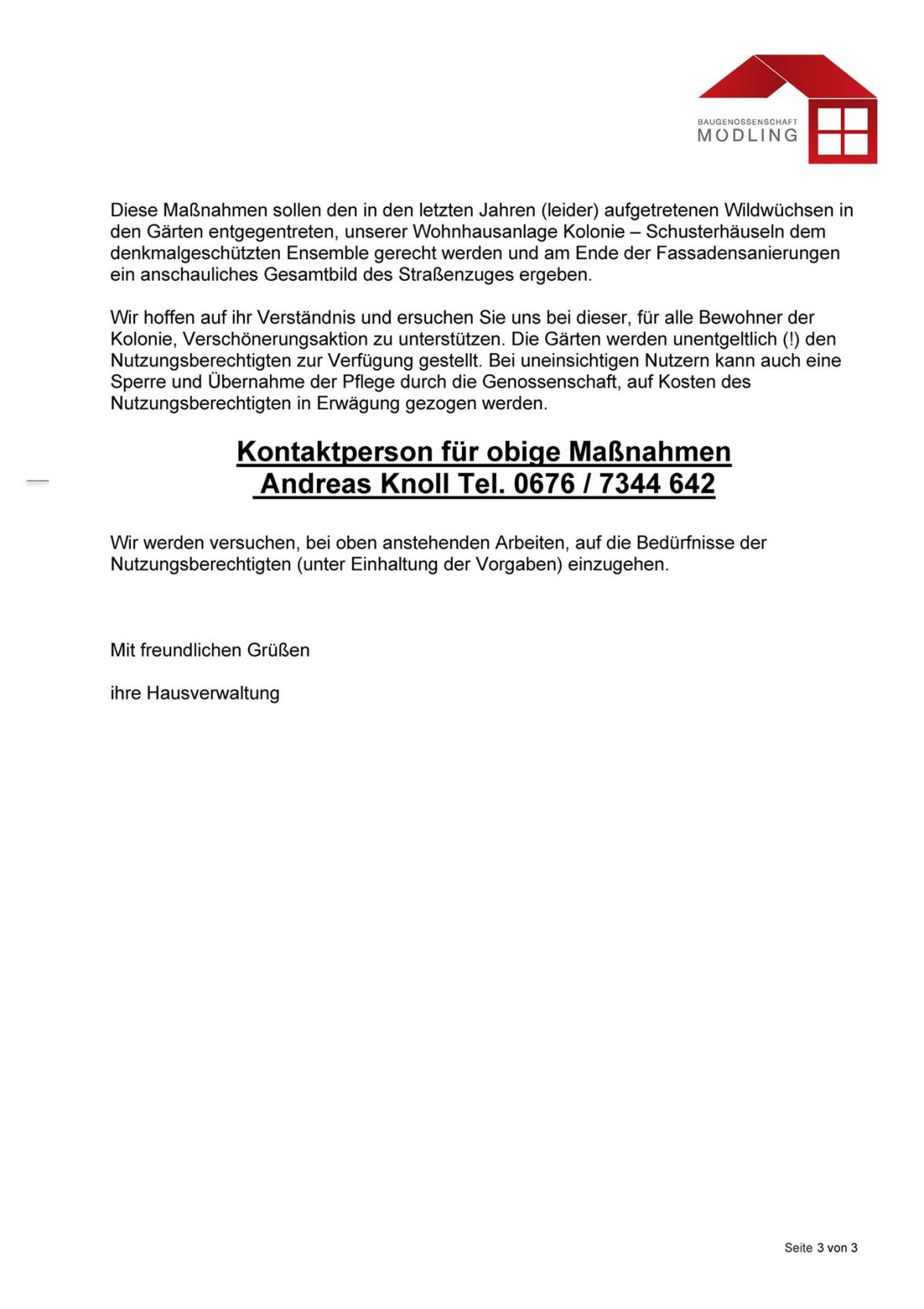 Die Pflege und Gestaltung der Gärten sollte jedem Mieter am Herzen liegen. Wir haben das Privileg in einer der ältesten denkmalgeschützten Arbeitersiedlungen Europas zu wohnen und dies bei niedrigen Nutzungsbeiträgen! Da in den nächsten Jahren die Sanierung der Fassaden in Angriff genommen wird hoffen wir, dass die (wenigen) Mieter welche betroffen sind etwas zum Gesamtbild der Wohnhausanlage beitragen werden.