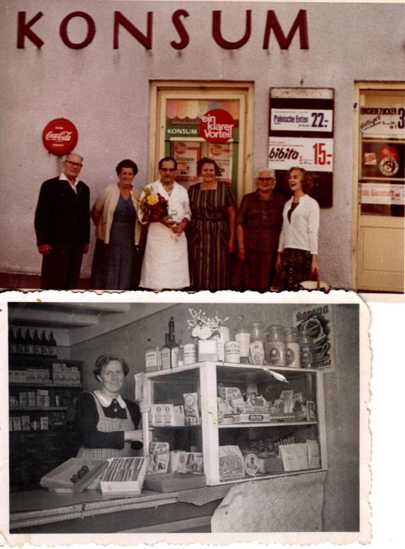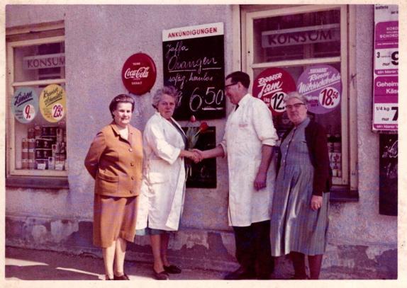 links stehend 1 Hr Haindl (ehem. Bürgrmeister Wr.Neudorf) 2 Frau Rasser, 3 Hr. Holzmann - Filialleiter, 4 Fr. Haindl. Nach dem Neubau der Konsumfiliale in der Schillerstraße im Jahre 1985, wurde die Filiale in der Kolonie geschlossen.