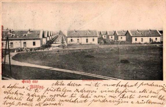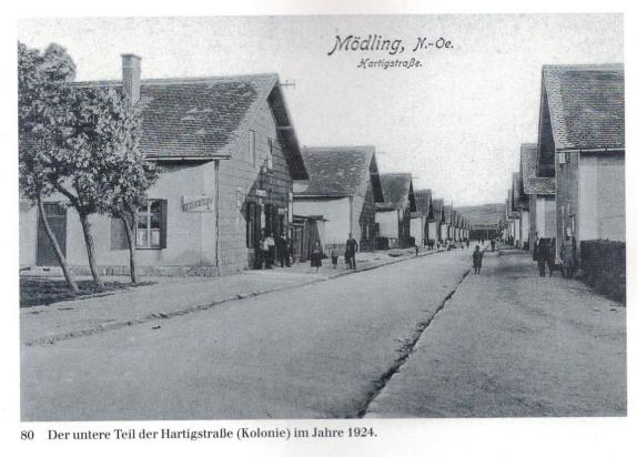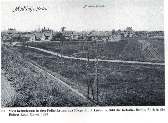 Luftaufnahme der Korsteinfabrik mit der unteren Kolonie ab 1948 (auf Hartigstraße 13 ist die damalige Konsumfiliale zu sehen) Im oberen Teil des Fotos ist die damalige Bundesanstalt für Tierseuchenbekämpfung zu sehen. Quelle: Dr. Peter Standenat - Mödlinger Stadtverkehrsmuseum