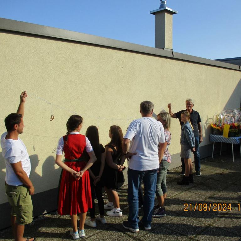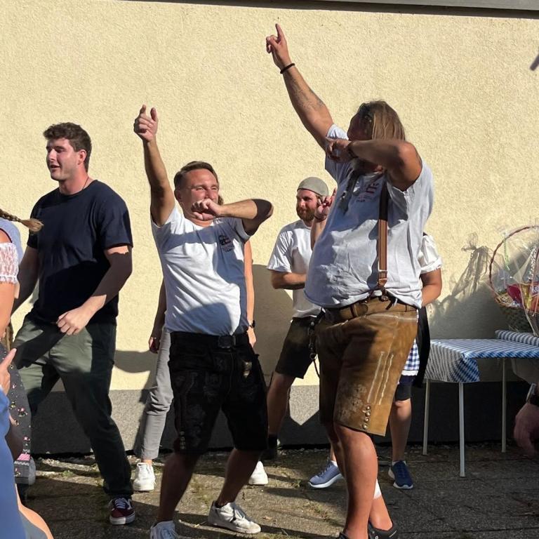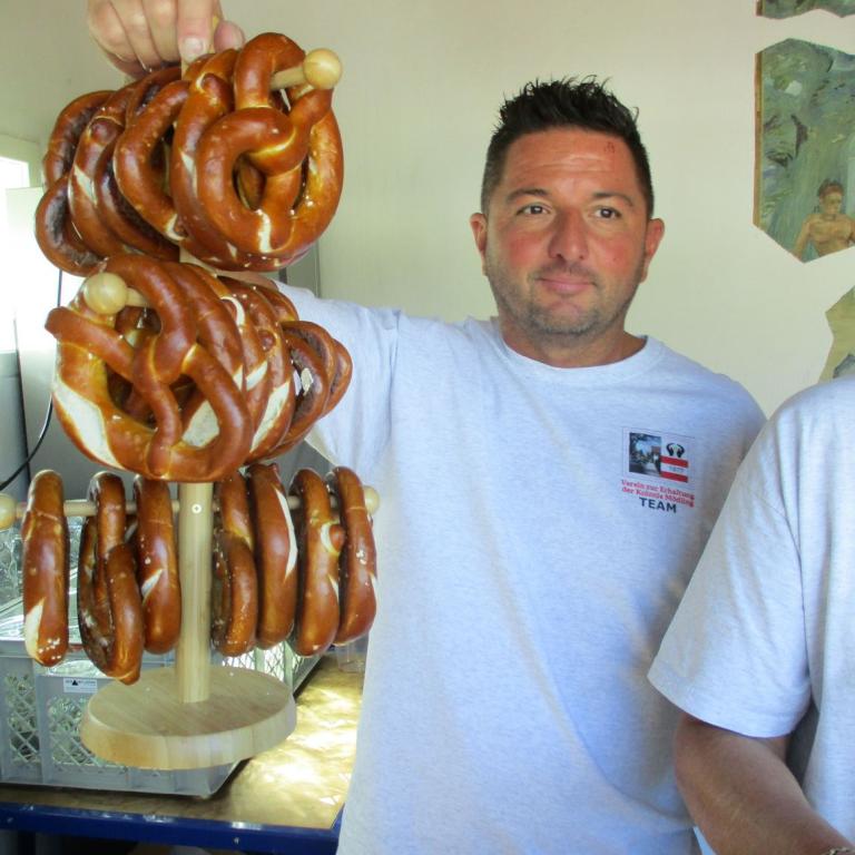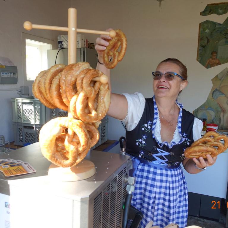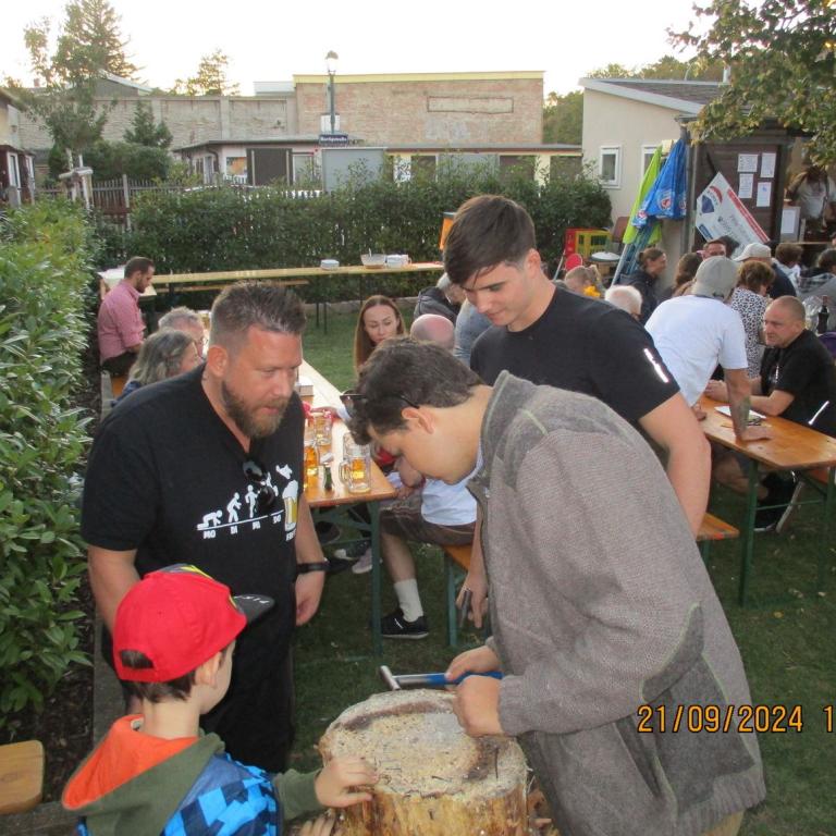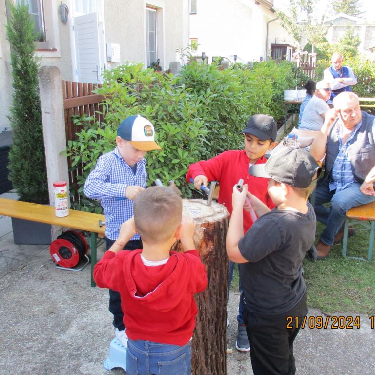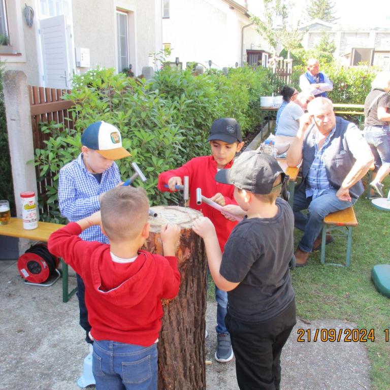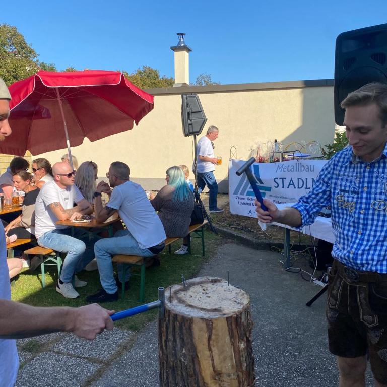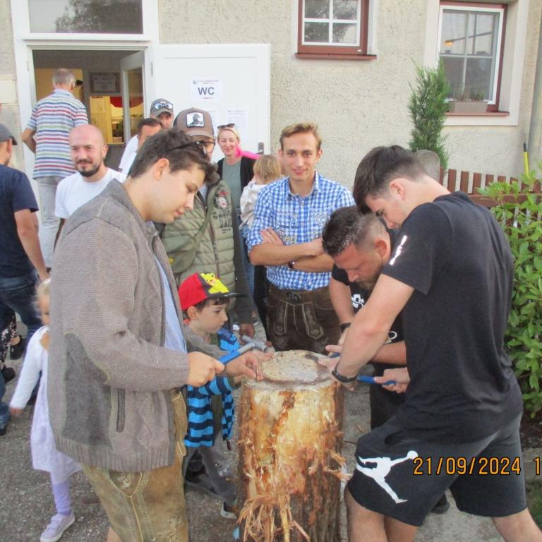 Die anderen Gäste konnten sich beim Hackstocknageln messen. Auch die Kinder kamen nicht zu kurz. Dosenschießen und Brezenwettbewerb war beliebt.
