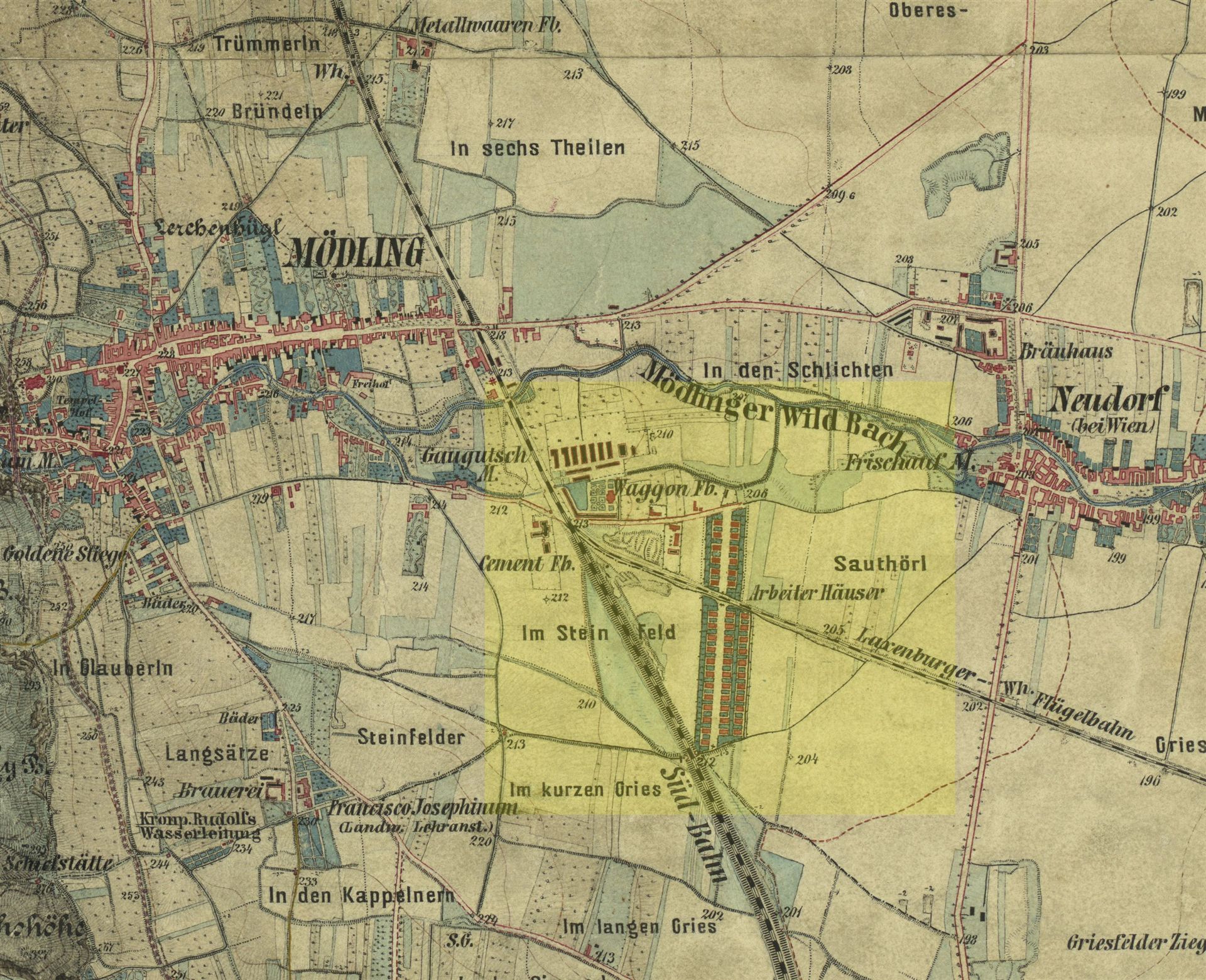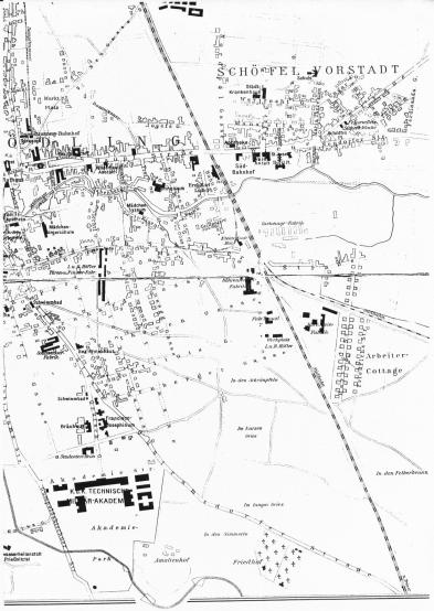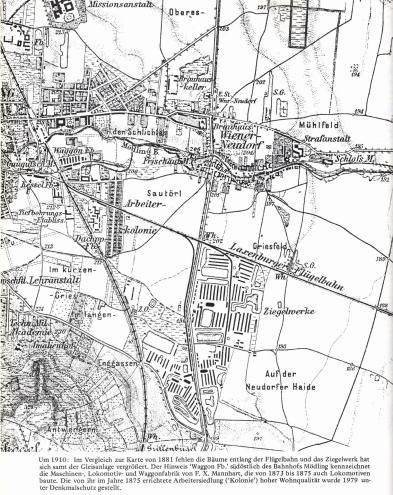 Ein Zusammenstellung alter Feldkarten zeigt sehr schön die bauliche Entwicklung rund um die Kolonie. Die Jahresangaben variieren teilweise. So ist die Karte von 1870 wohl um 1872 (Errichtung der Arbeitersiedlung). Bei der Karte um 1910 wäre die Beschriftung richtig "1872 Errichtung der Arbeitersiedlung und 1978 unter Denkmalschutz gestellt".