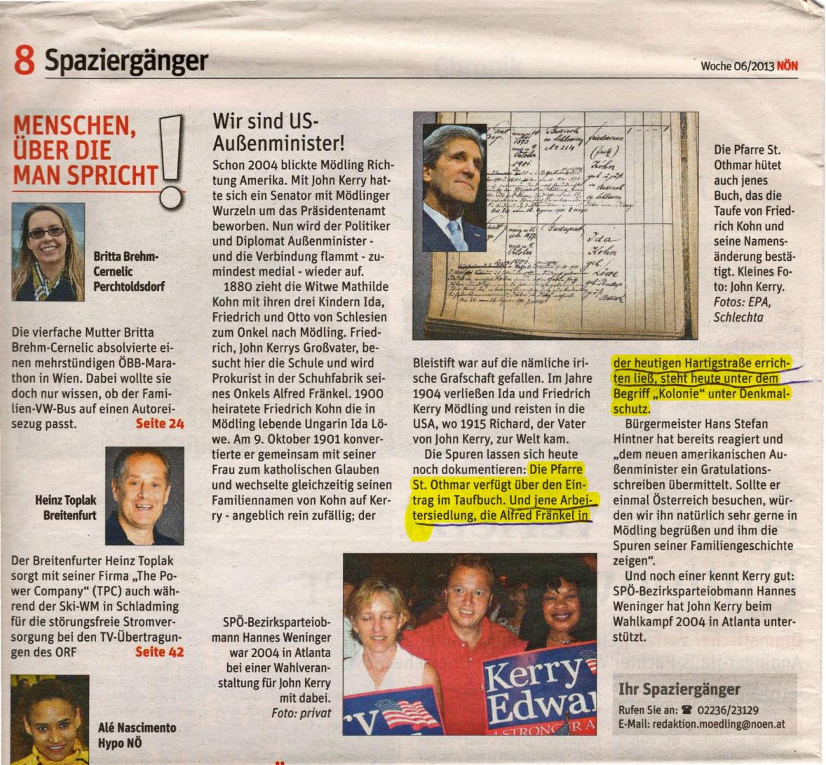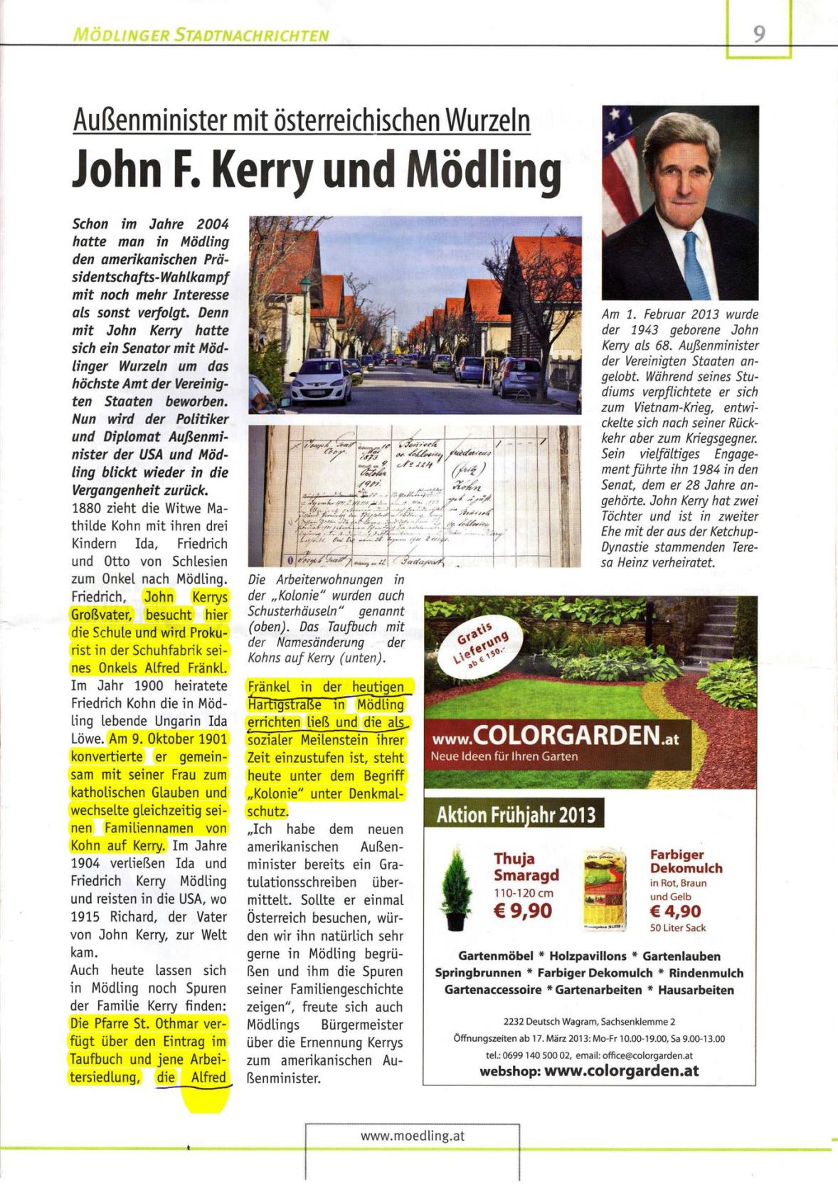 John F. Kerry - ehem. Außenminister der USA - hat seine Wurzeln in Mödling. Sein Großvater Friedrich Kerry war Prokurist in der Schuhfabrik des Onkel Alfred Fränkel, der im Jahre 1883 die ehemalige "Lokomotiv- und Waggonbaufabrik der Industrie-, Forst- und Eisenbahngesellschaft" samt den dazugehörigen Arbeiterhäusern kaufte, welche er bereits 1875 in eine Schuhfabrik umbaute.