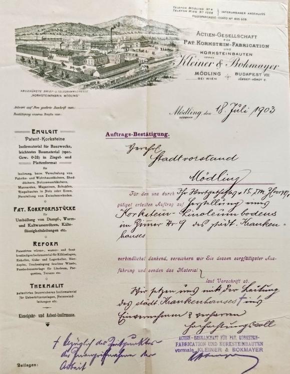 Die Korksteinfabrik pries in einer Werbeeinschaltung 1928 neben den Korkstein noch Presskorkparketten an. Unter der Telefonnummer 4(!) konnte man weitere Informationen darüber erhalten. Drei Jahrzehnte später ist gerade eine Lieferung "Jungfernrinde" aus den Korkeichenwäldern Portugals im Werk eingetroffen und die Angestellten gruppierten sich davor um das 40jährige Betriebsjubiläum von Fr. Buchart zu begehen. Man findet den Prokuristen Anton Couf (ganz rechts), aber auch seine Tochter Elfriede Couf-Lindtner sowie Trude Dvoran-Illigasch, Franzi Pichler-Richter, Walter Tschirz und Ekkehard Schleser. Quelle: Mödling in alten Ansichten Band 2 - Dr. Kurt Janetschek