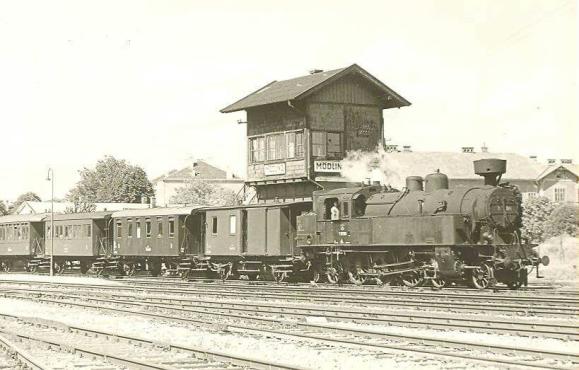 Die Luftaufnahme aus der Zwischenkriegszeit zeigt rechts unten den Südbahndamm, links die Laxenburgbahn. Die abgebildete Korksteinfabrik hatte sich auf die Erzeugung von Isoliermitteln aller Art spezialisiert. Quelle: Mödling in alten Ansichten Band 2 - Dr. Kurt Janetschek