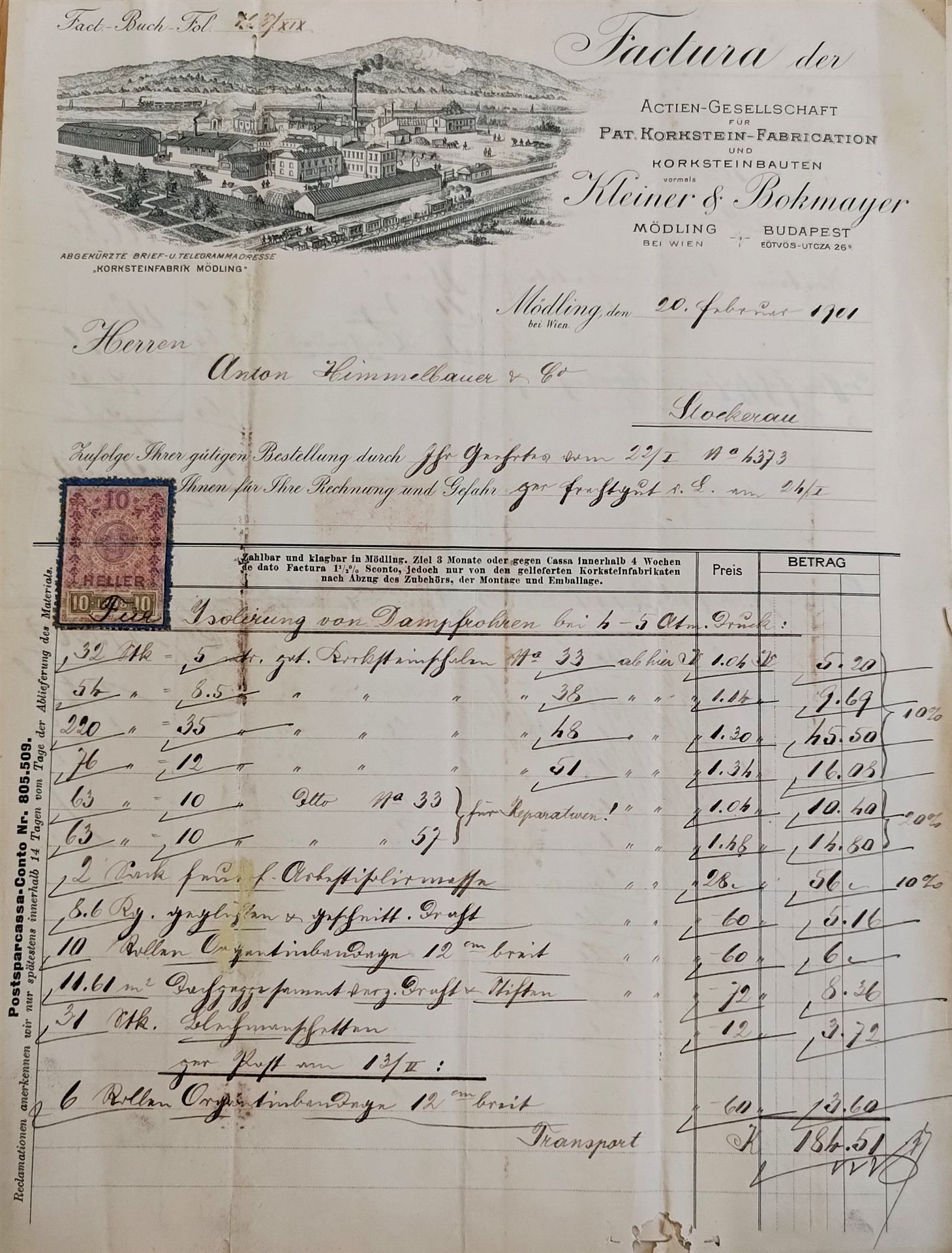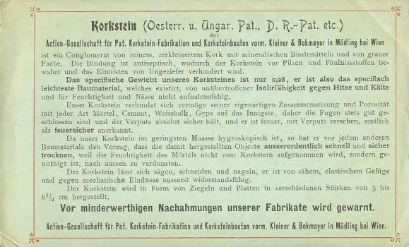 Die Korksteinfabrik wurde 1884 von Eugen Kleiner und Walter Bokmayer gegründet und steht heute unter Denkmalschutz. Nach der Schließung und Übersiedelung der Schuhfabrik von Alfred Fränkel im Jahre 1902, verloren die Schuster und ArbeiterInnen ihren Job. In dieser Zeit fanden viele Koloniebewohner Arbeit in der Korksteinfabrik.