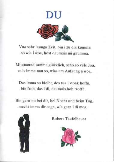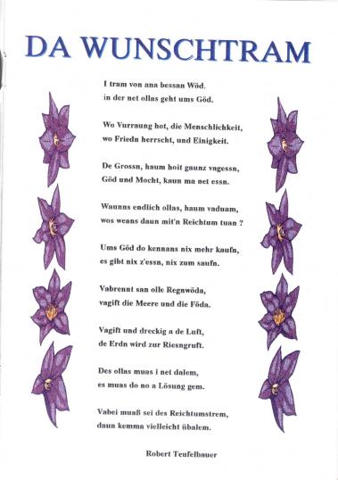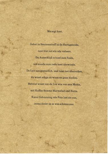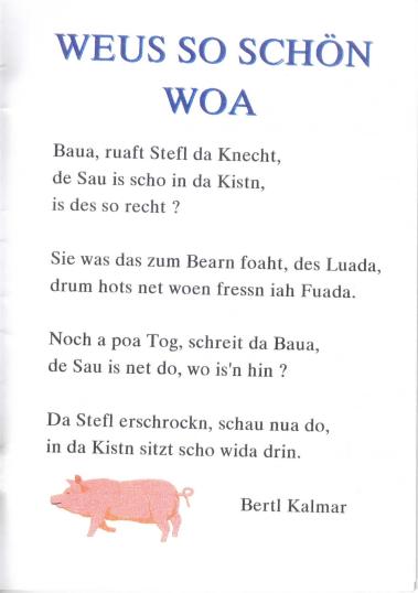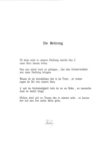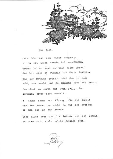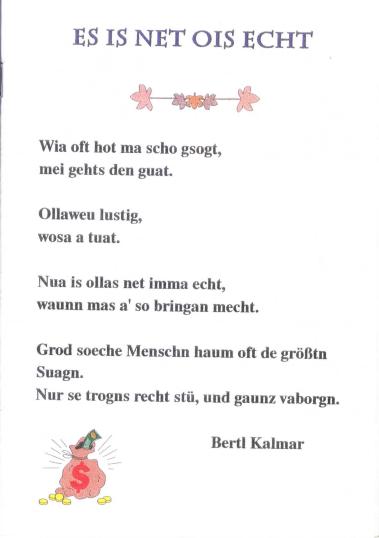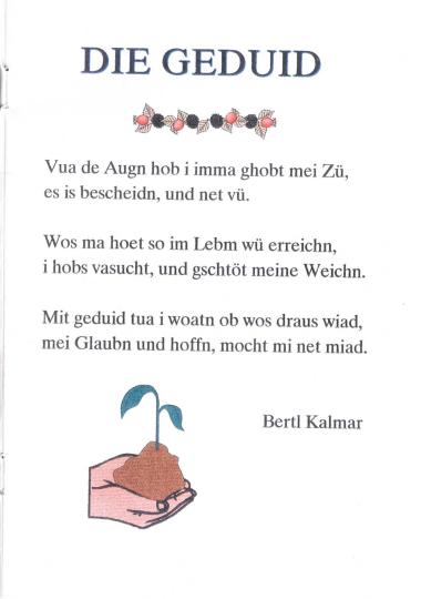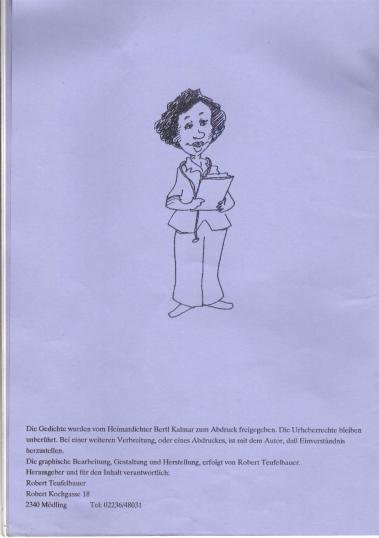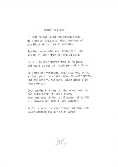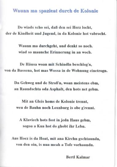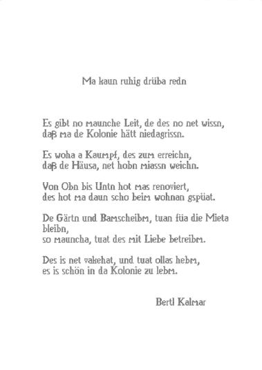 Aus dem Nachlass von Franz Knoll und mit freundlicher Genehmigung der Witwe Elisabeth Kalmar, hier die im Jahre 1994 veröffentlichten Gedichte eines der Urbewohner der Kolonie und beliebten Mundartdichter Bertl Kalmar. Dieser hat bei Veranstaltungen des Vereins immer wieder seine Gedichte vorgetragen.