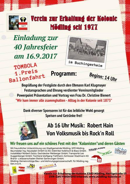 Anlässlich des 40 jährigen Bestehens des Vereines wurde am Samstag den 17.September 2017 im neu renovierten Buchingerheim eine Feier ausgerichtet. Nach Begrüßung der Festgäste durch den Obmann Karl Klugmayer hielt Frau Dr. Christine Bienert einen geschichtlichen Vortrag, wobei den Gästen mit alten Fotodokumenten die Geschichte der Kolonie näher gebracht wurde. Über das Leben um die Jahrhundertwende bis in die Nachkriegszeit erfuhren wir in welch ärmlichen Verhältnis die Menschen in dieser Zeit gelebt haben. Frau Dr. Bienert lockerte diesen zeitgeschichtlichen Vortrag mit einigen Anekdoten alter Koloniebewohner auf. Dieser interessante Vortrag hat den anwesenden KoloniebewohnerInnen aufgezeigt in welchen geschichtsträchtigen Häusern sie wohnen und der durch den Verein erwirkte Denkmalschutz diese vor dem Abriss bewahrt hat.