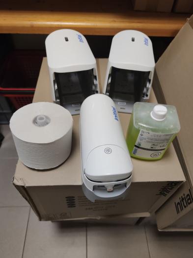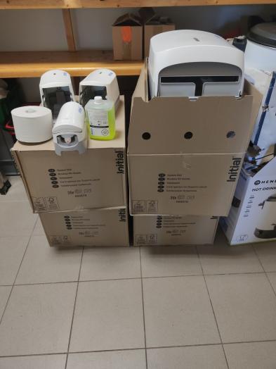 Im Paket enthalten sind: 2 WC Rollenspender; 1 Papierhandtuchspender; 1 Seifenspender; 4 Karton mit je 36 Rollen WC Papier; 6 Flaschen Seife;