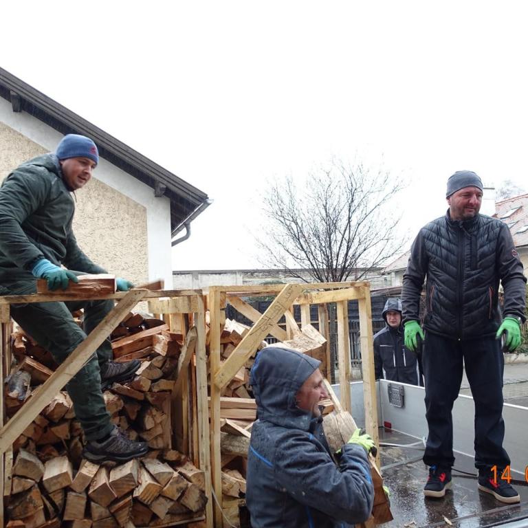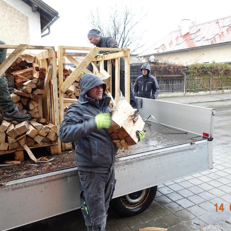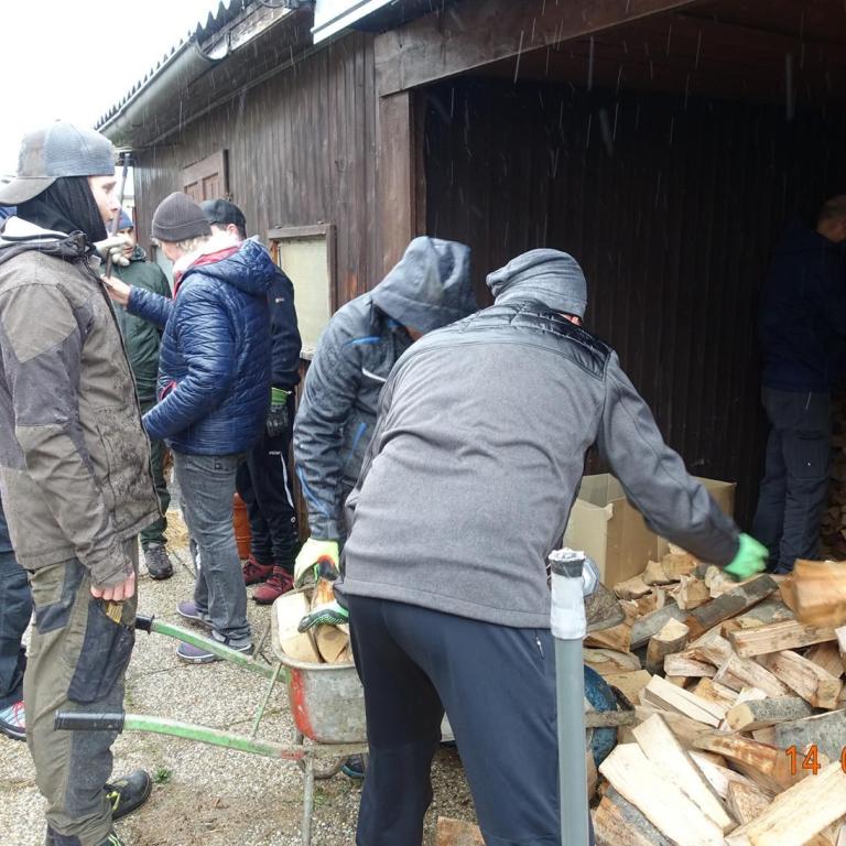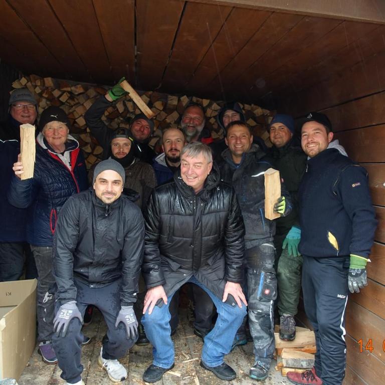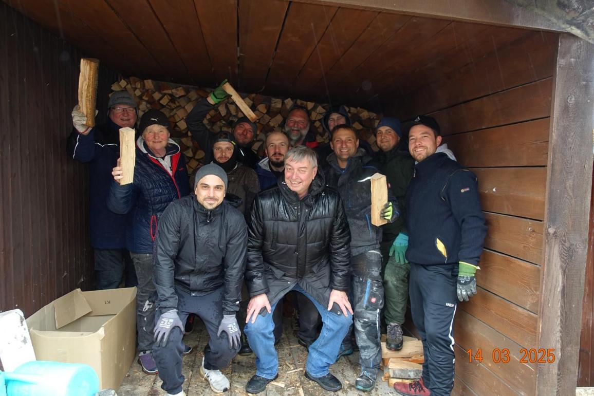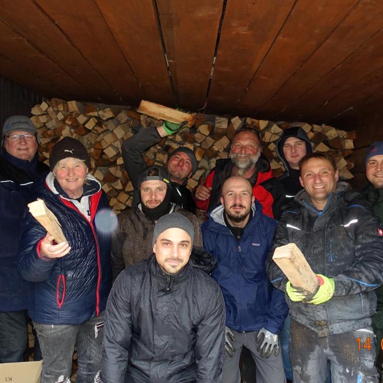11 Mann räumten, bei kalten und regnerischen Wetter, die Holzlieferung in Windeseile in den Schuppen. Danke den zahlreichen Helfern.