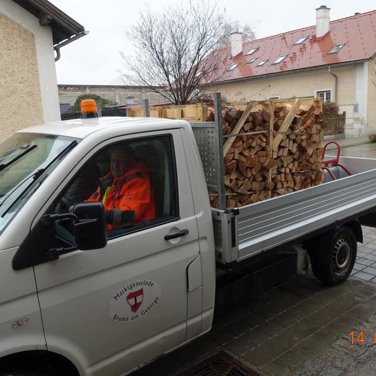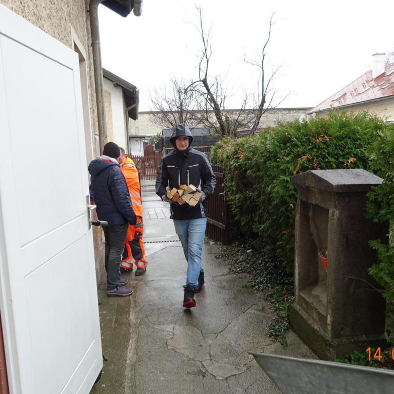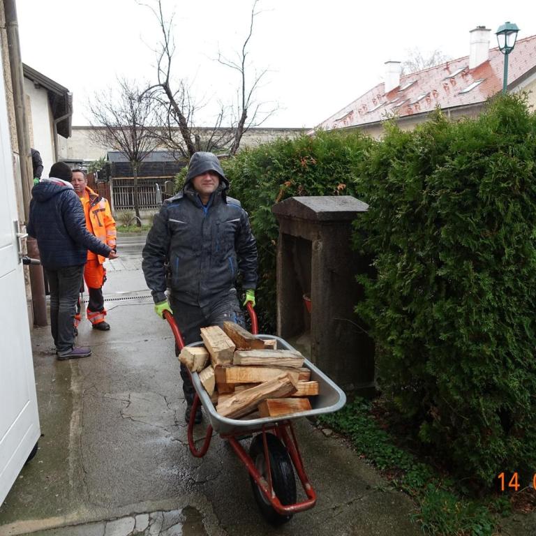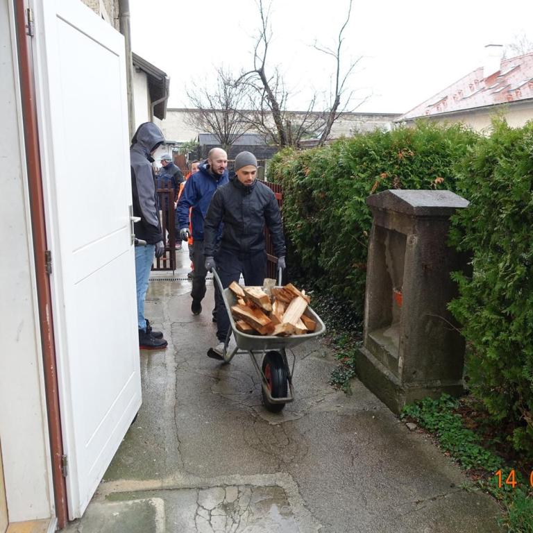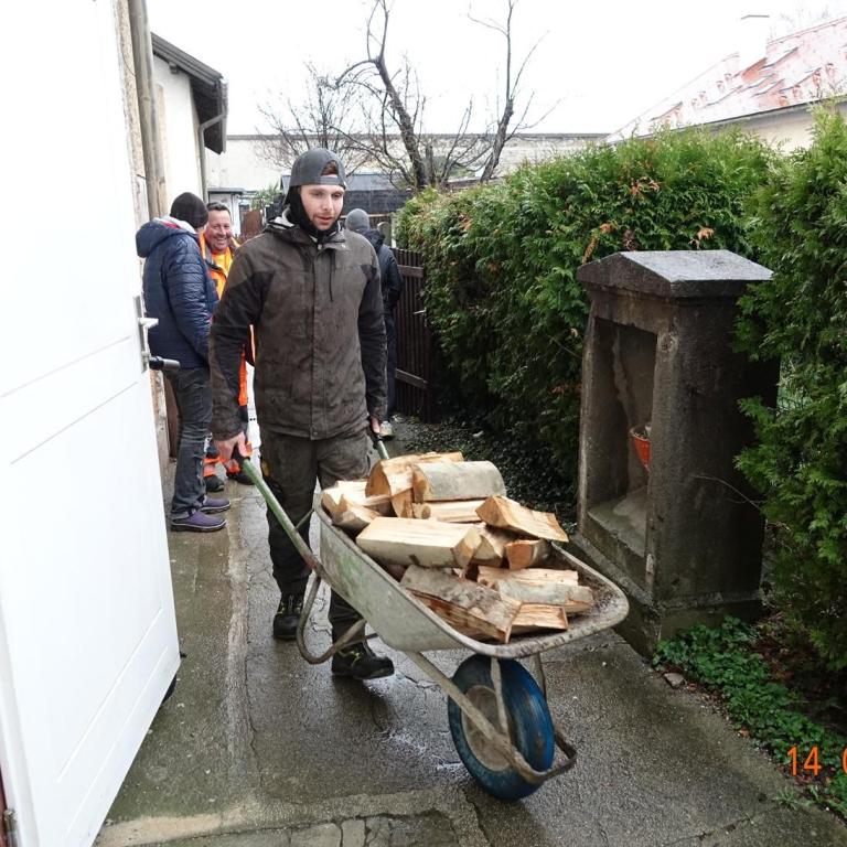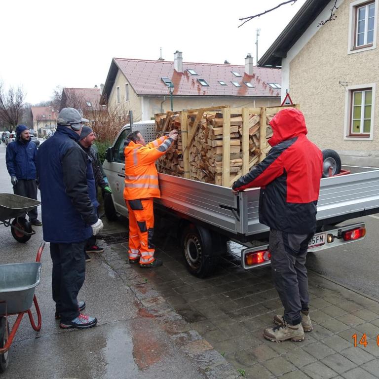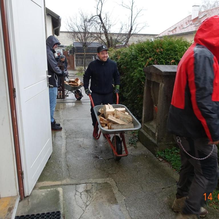 11 Mann räumten, bei kalten und regnerischen Wetter, die Holzlieferung in Windeseile in den Schuppen. Danke den zahlreichen Helfern.