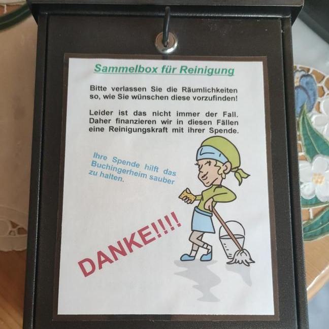 Der Verein ist für die Vermietung des Buchingerheims verantwortlich. Verschiedene Veranstaltungen wie Gymnastikstunden, Pensionistentreff, Kindergeburtstage ua. werden gebucht. Leider werden die Räumlichkeiten nicht immer in dem Zustand hinterlassen wie sie vorgefunden wurden. Für solche Fälle haben wir eine Sammelbox für eine Reinigungskraft und Material wie Seife, WC Papier, Papierhandtücher usw. beim Eingang angebracht.