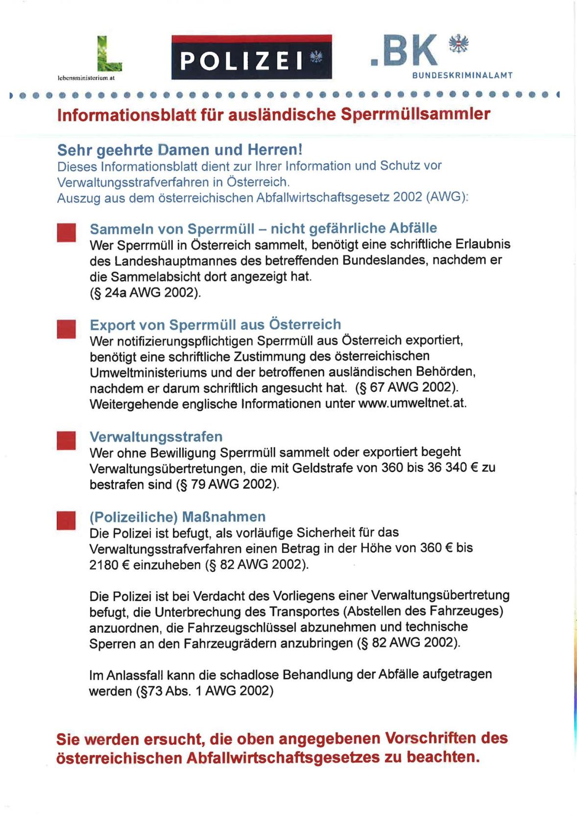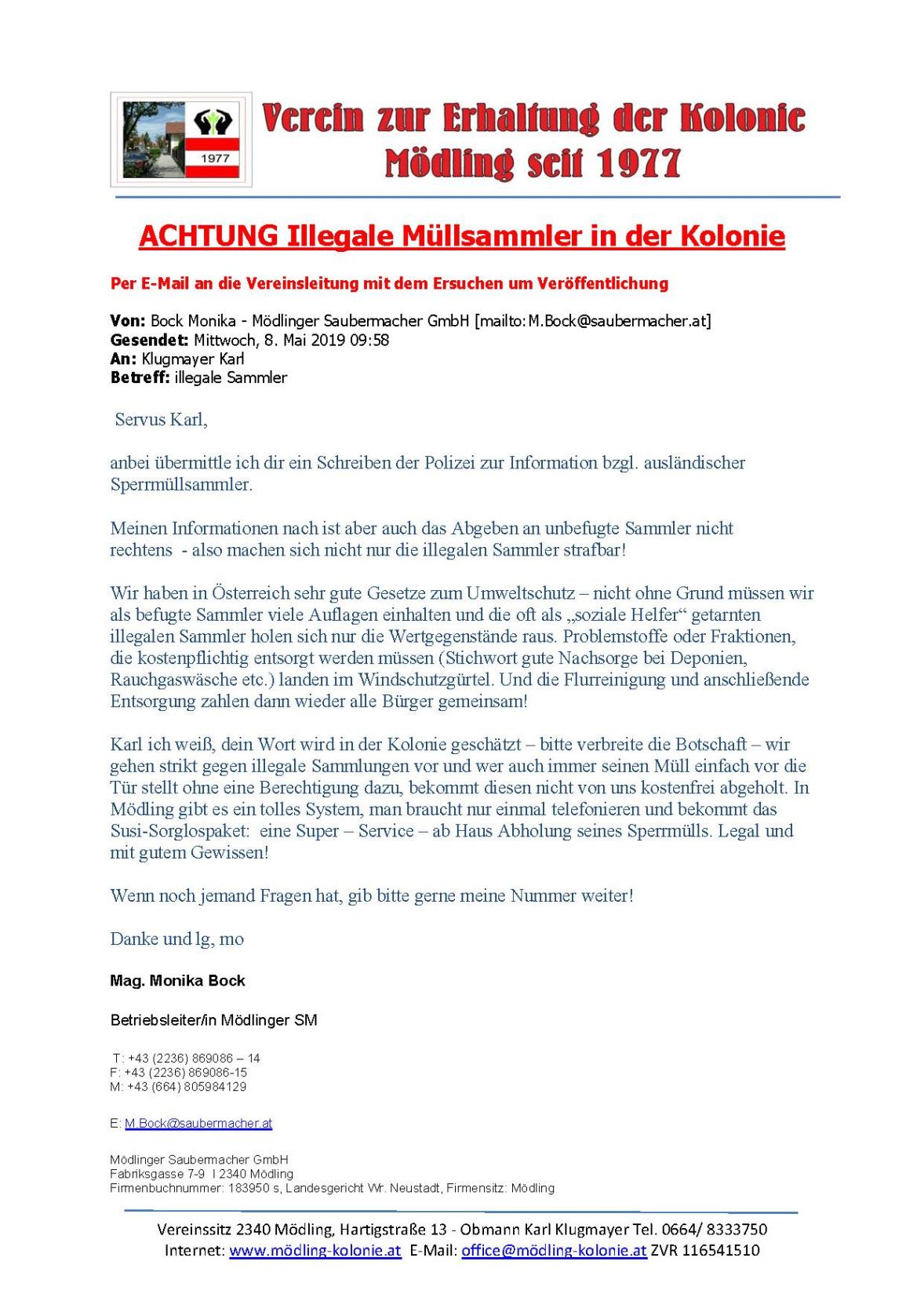 Aus gegebenen Anlass (Verteilung von Zettel in der Kolonie durch ausländische Sammler mit der Aufforderung um Abgabe von Sperrmüll) wurde die Vereinsleitung ersucht folgendes E-Mail der Mödlinger Saubermacher GmbH zu veröffentlichen.
