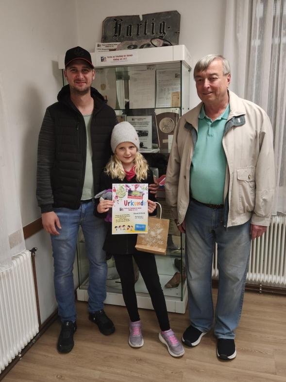 Zwei Arbeiten von Kindern aus der Kolonie kamen in die engere Auswahl und wurden in der Ausstellung ausgehängt. Am Ende der Preisverleihung durfte der Verein zur Erhaltung der Kolonie, vertreten durch Obmann Karl Klugmayer und Erich Walter, sich mit einer Urkunde und einem kleinen Geschenk bei Philipp Aigner für seine Teilnahme bedanken. Sarah Knoll war leider erkrankt, wobei wir die Übergabe am 15. Oktober nachholten.