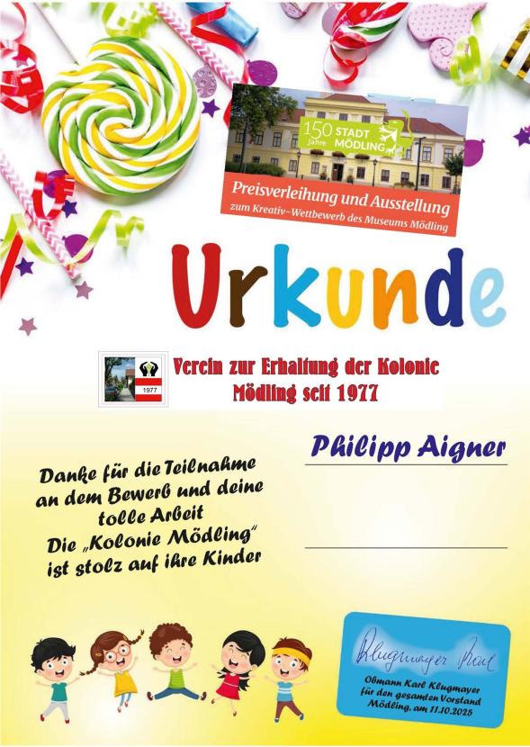 Am Samstag den 11. Oktober 2025 fand die Preisverleihung des kreativen Kinder- u. Jugendwettbewerbs des Museum Mödling statt. Zum Thema "Das macht für mich meine Stadt aus" wurde im Zuge der 150 Jahres Feierlichkeiten eine Sonderausstellung eingerichtet. 205 Kinder und Jugendliche haben mit 109 Arbeiten an dem Wettbewerb teilgenommen.